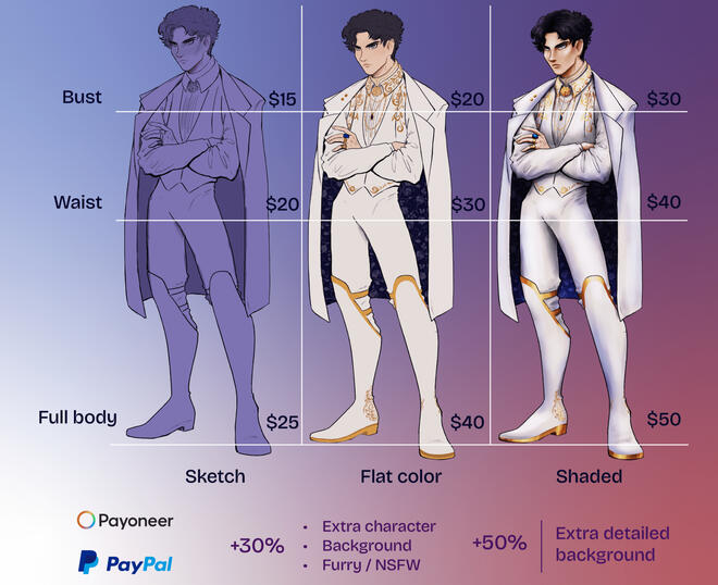 Special ContentNSFW and furry commissions are accepted with an additional charge of 30%.